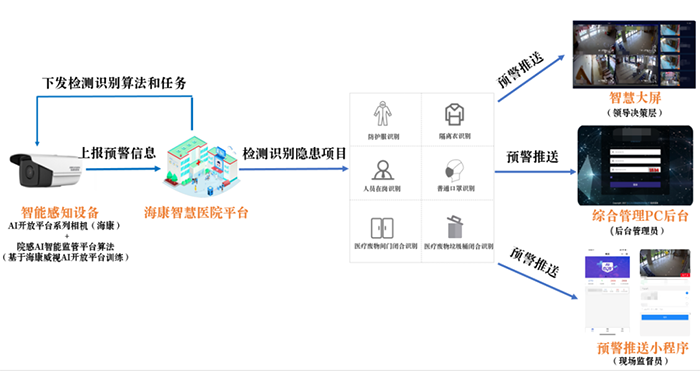 內(nèi)置AI算法的智能感知設(shè)備采集存在疫情防控隱患信息的視頻數(shù)據(jù),海康智慧醫(yī)院平臺對視頻數(shù)據(jù)智能分析,識別疫情防控隱患,形成預(yù)警事件信息(未佩戴口罩、體溫異常、未穿防護服等),并傳送至院感AI智能監(jiān)管平臺。
