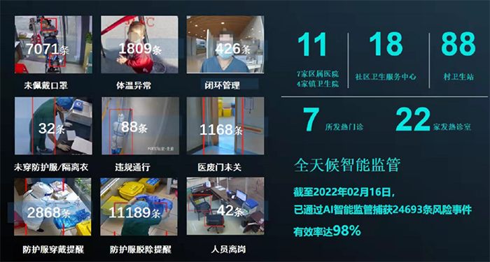 截止2022年2月16日,院感AI智能監(jiān)管平臺已通過視頻智能分析技術(shù)捕獲24693條風(fēng)險事件,有效率達98%(如下圖),為城市疫情防控工作持續(xù)保駕護航: