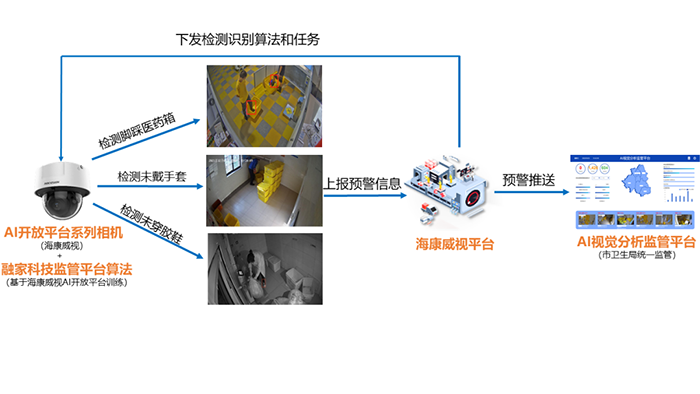 智能攝像機(jī)采集醫(yī)療廢物暫存間視頻圖像,通過(guò)海康威視AI開(kāi)放平臺(tái)生成的算法模型識(shí)別工作人員未戴手套、未穿膠鞋、腳踩醫(yī)療廢物等醫(yī)療廢物處置問(wèn)題,形成預(yù)警事件信息,并傳送至AI視覺(jué)分析監(jiān)管平臺(tái)。