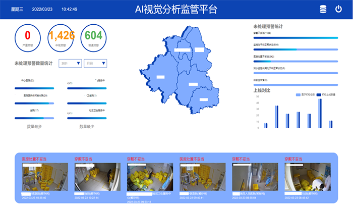 AI視覺(jué)分析監(jiān)管平臺(tái)直觀展現(xiàn)預(yù)警大數(shù)據(jù)分析結(jié)果,監(jiān)管部門(mén)經(jīng)過(guò)接收醫(yī)療機(jī)構(gòu)預(yù)警處理狀況,整體把握區(qū)域內(nèi)的辦理狀況,全面強(qiáng)化了衛(wèi)生健康綜合執(zhí)法監(jiān)管力度。