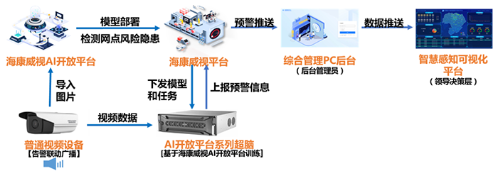 根據(jù)國家對金融科技發(fā)展的規(guī)劃要求,以及銀行網(wǎng)點(diǎn)推進(jìn)數(shù)字化轉(zhuǎn)型的實(shí)際需要,場景現(xiàn)場采用“視頻+AI” 技術(shù),通過海康威視AI開放平臺訓(xùn)練的場景化AI算法,對銀行網(wǎng)點(diǎn)內(nèi)隱患事件進(jìn)行檢測并實(shí)時(shí)報(bào)警,有效保障網(wǎng)點(diǎn)安全、高效運(yùn)轉(zhuǎn)。