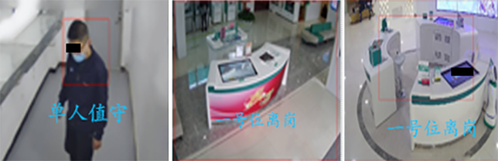 針對廳堂內(nèi)保安人員或者重要工作崗位上長時(shí)間無人,單人進(jìn)入加鈔間等情況及時(shí)發(fā)現(xiàn)并報(bào)警至后臺,同時(shí)保留相應(yīng)的視頻和圖片,可用于后續(xù)網(wǎng)點(diǎn)合規(guī)的標(biāo)準(zhǔn)化。