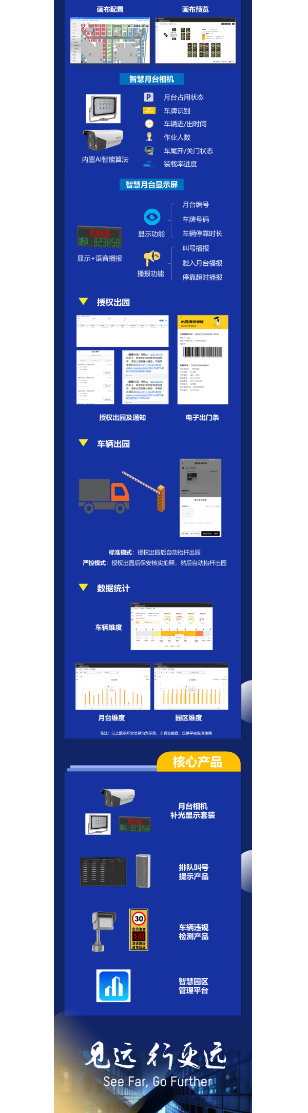 覆蓋園區(qū)門崗、月臺、單證室等作業(yè)場景,實(shí)現(xiàn)園區(qū)物流車輛預(yù)約、審批、排隊(duì)、叫號、入園、月臺作業(yè)及授權(quán)出園等全鏈路的線上化數(shù)字化智能化管理,提效降本。